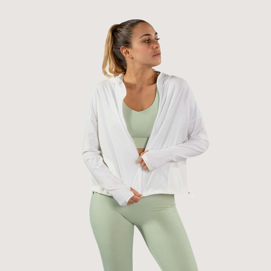 With a relaxed fit, full zip front, and adjustable hood, it delivers comfort and function in equal measure. Elastic cuffs and hem keep the fit secure, while side pockets offer on-the-go storage. Whether you’re heading to the studio or out for a morning stroll, this jacket keeps things easy, breezy, and effortlessly on-trend.