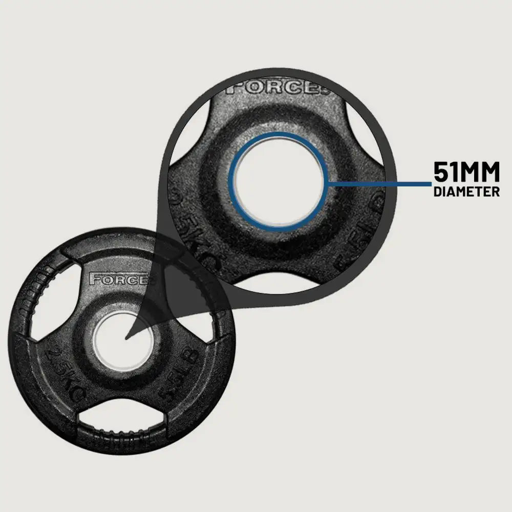 Force USA Rubber Coated Olympic Weight Plates are specifically designed for everyday gym use, featuring an easy-to-use tri-grip design. Whether you're training on a smith machine, power cage, squat racks, or engaging in other free weight exercises, these plates offer effortless plate changes with their ergonomic, tri-grip handles, ensuring safer and more efficient workouts.