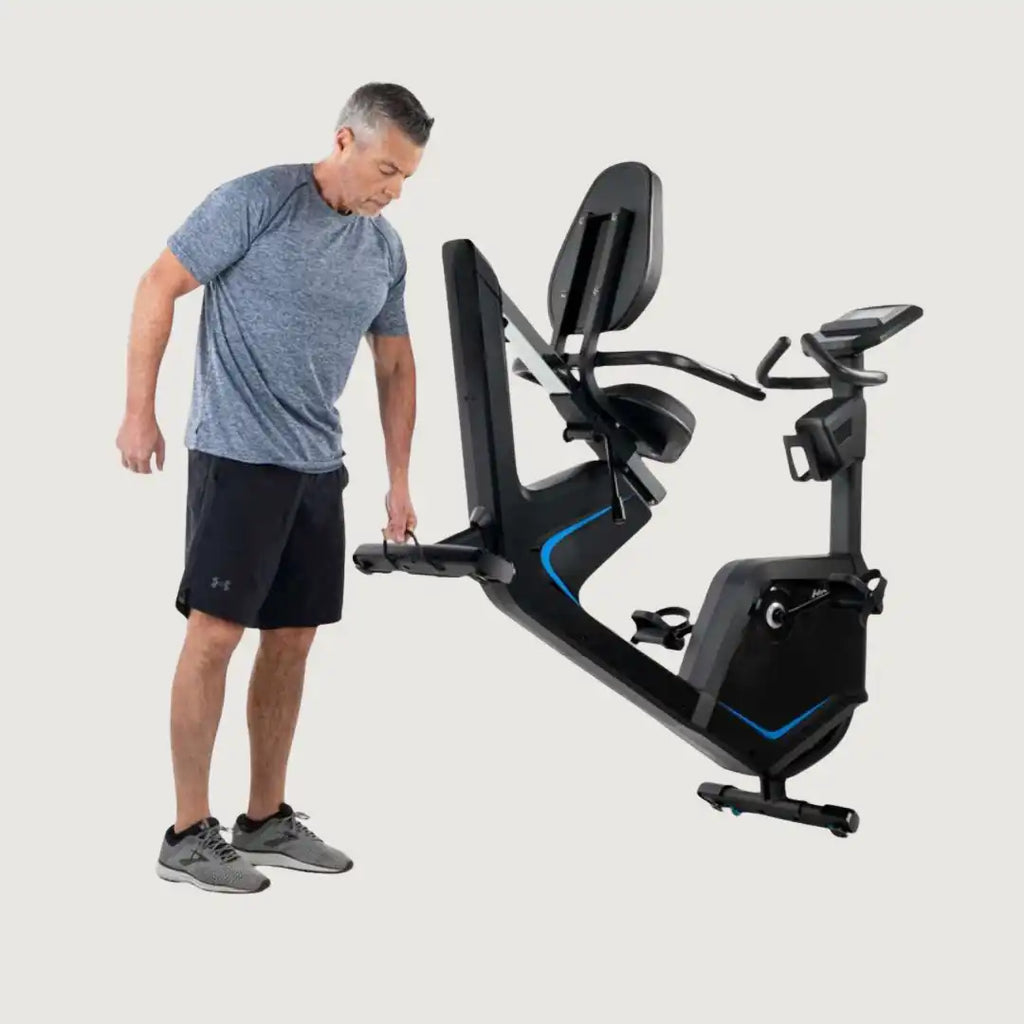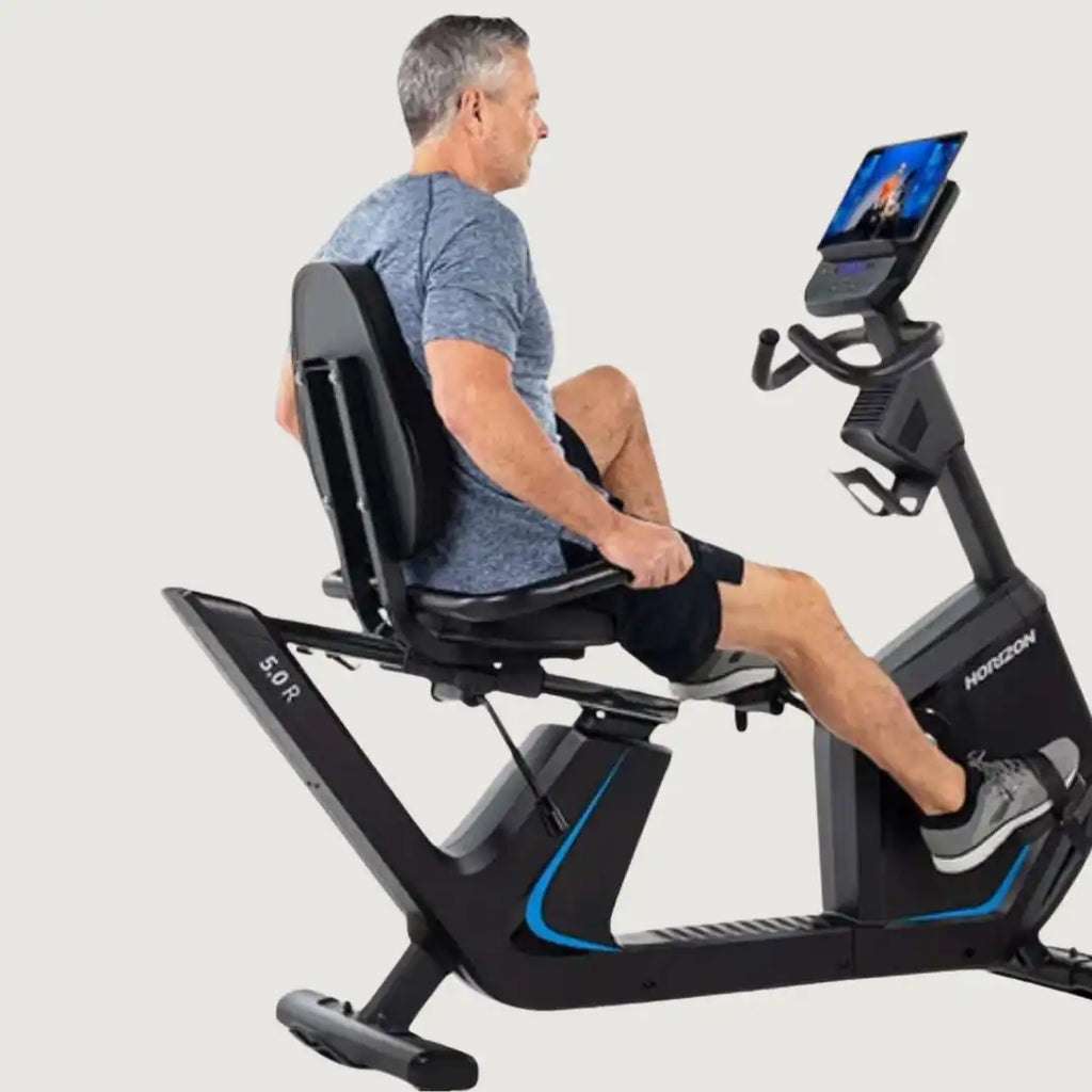 The Horizon 5.0R Recumbent Bike offers a comfortable, low-impact cardio experience with features designed for home fitness and senior users. The bike’s open step-through frame and extra-large seat with lumbar support allow for easy mounting and a secure, ergonomic ride. With horizontal seat adjustment on an aluminum rail, users can fine-tune positioning to match leg length and comfort needs. Built with ECB magnetic resistance and 100 preset levels, it delivers smooth and precise intensity control at the push of a button. Seamless Bluetooth FTMS connectivity allows you to stream workout metrics to popular applications like Zwift or Peloton, while built-in conveniences like a 3-speed fan, tablet holder, USB charging, and water bottle cage enhance extended sessions. Warranty: 1 year