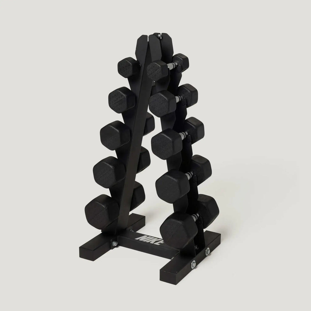 Holds up to 5 pairs of dumbbells vertically to maximize floor space.