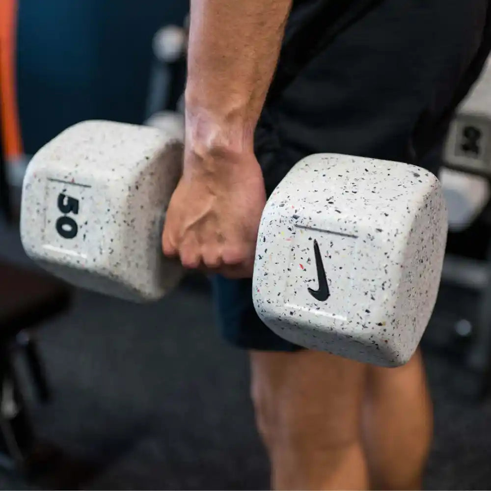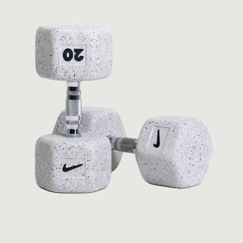 Note: Because footwear color palettes vary from season to season, each batch of Nike Grind rubber is unique and yields a limited edition run of these dumbbells as they're released. While these dumbbells will always have a consistent base color, the Nike Grind particle mixture will vary from product to product.