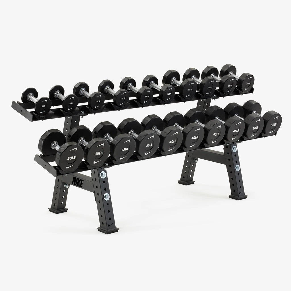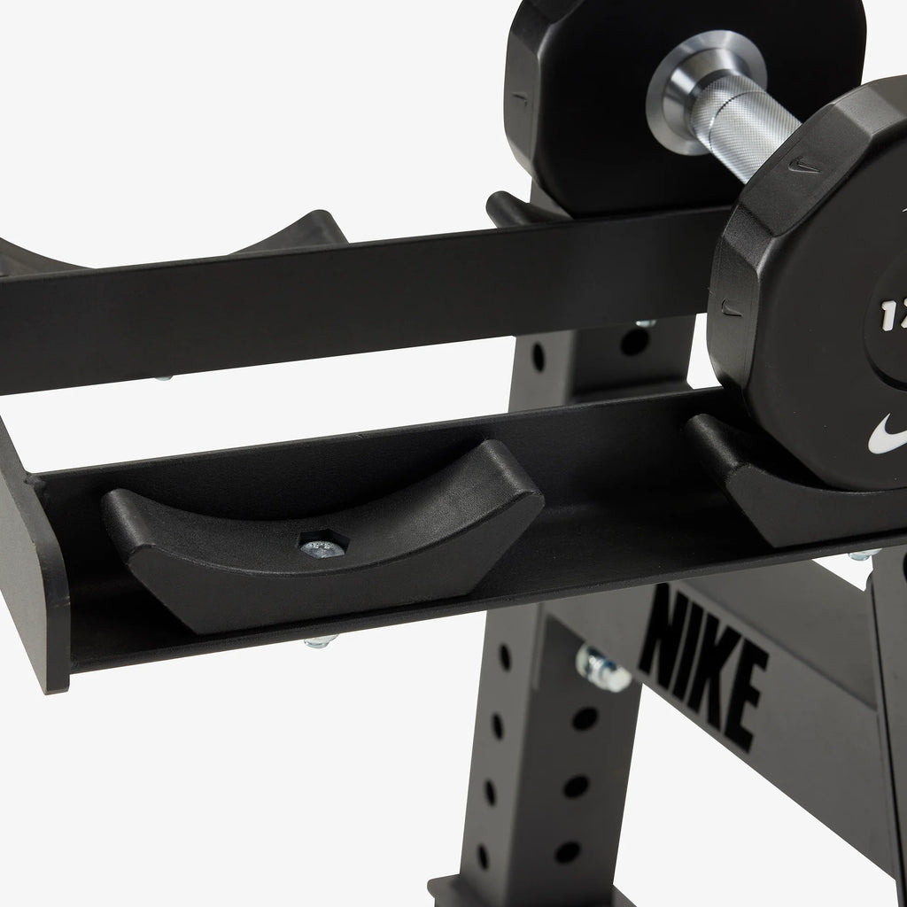 The Nike Strength Pro Urethane Dumbbell is the only recommended option to store on the Nike Strength Pro Urethane Dumbbell Rack. The Nike Dumbbell (rubber hex) and Nike Grind Dumbbell are not compatible with this rack.